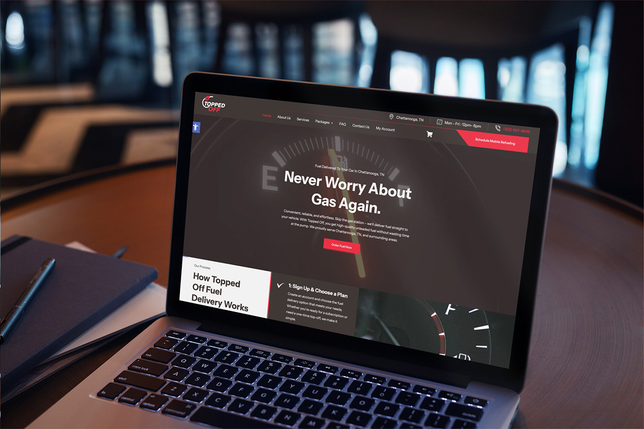 Topped Off, a new fuel delivery company in Chattanooga, needed a complete brand identity and an eCommerce-ready website. They required a professional look that inspired trust and a platform where customers could select gas packages, schedule service, and pay online with ease.